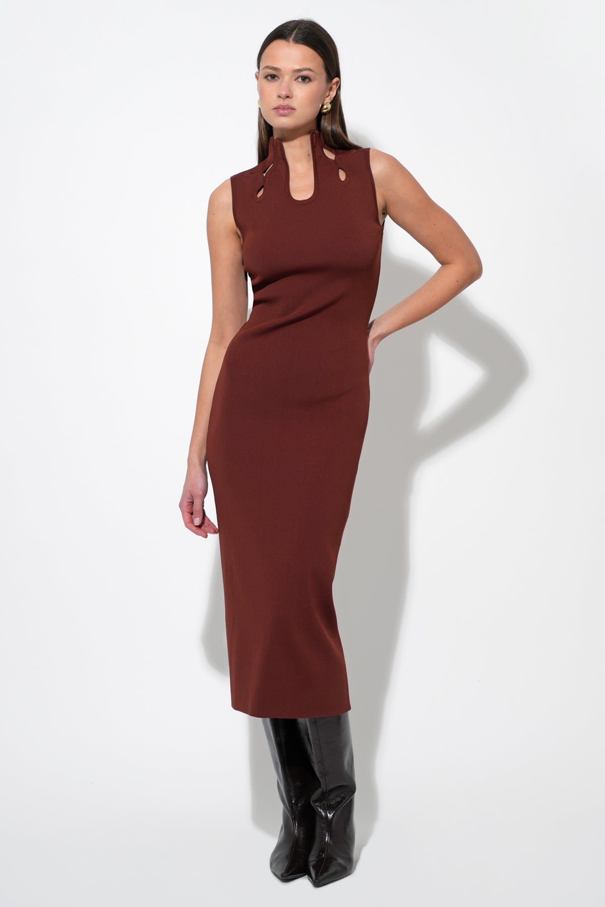This elegant midi dress is crafted from a luxurious, figure-sculpting ribbed knit fabric in a rich chocolate brown hue, offering both comfort and a sleek silhouette. It features a contemporary high neckline and striking cut-out details at the waist, adding a modern and alluring edge.