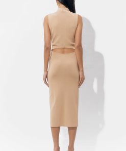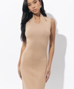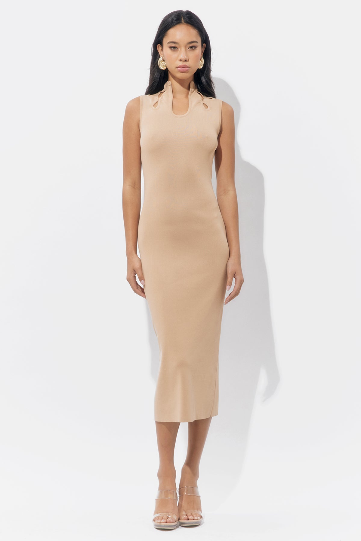 This elegant midi dress is crafted from a luxurious, figure-sculpting ribbed knit fabric in a delicate nude or light beige hue, offering both comfort and a sleek silhouette. It features a contemporary high neckline and striking cut-out details at the waist, adding a modern and alluring edge.